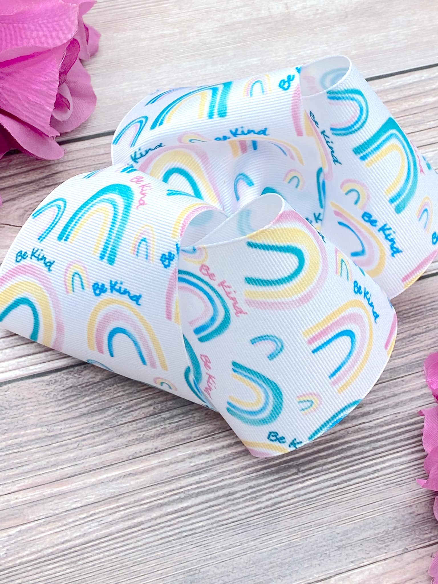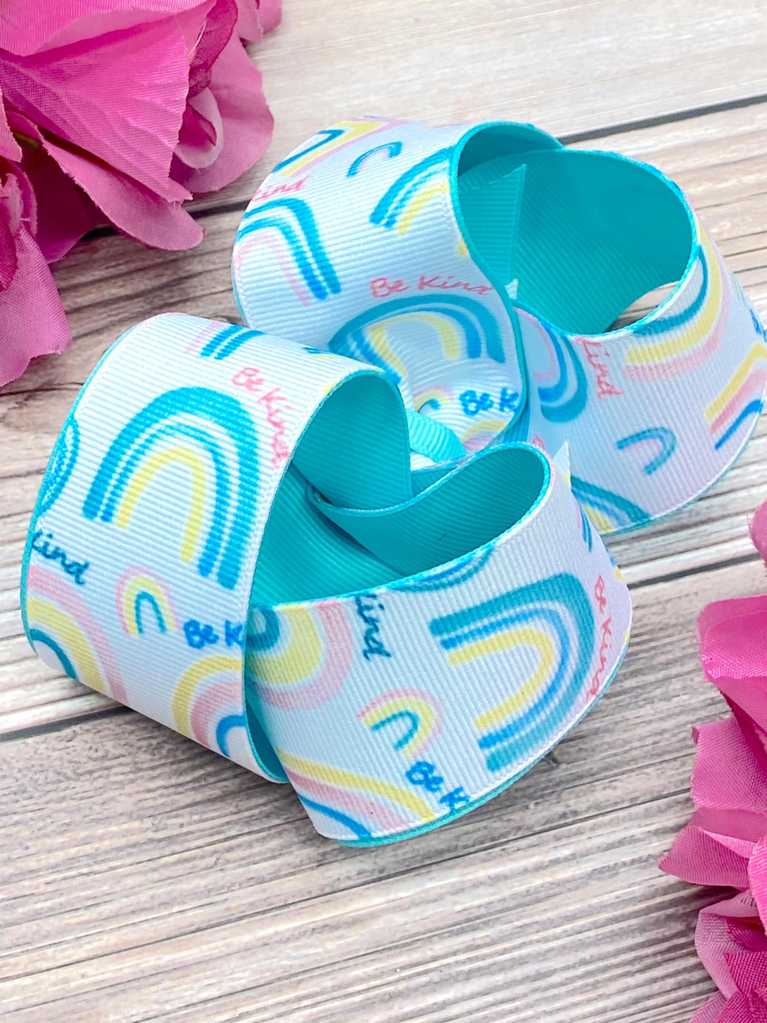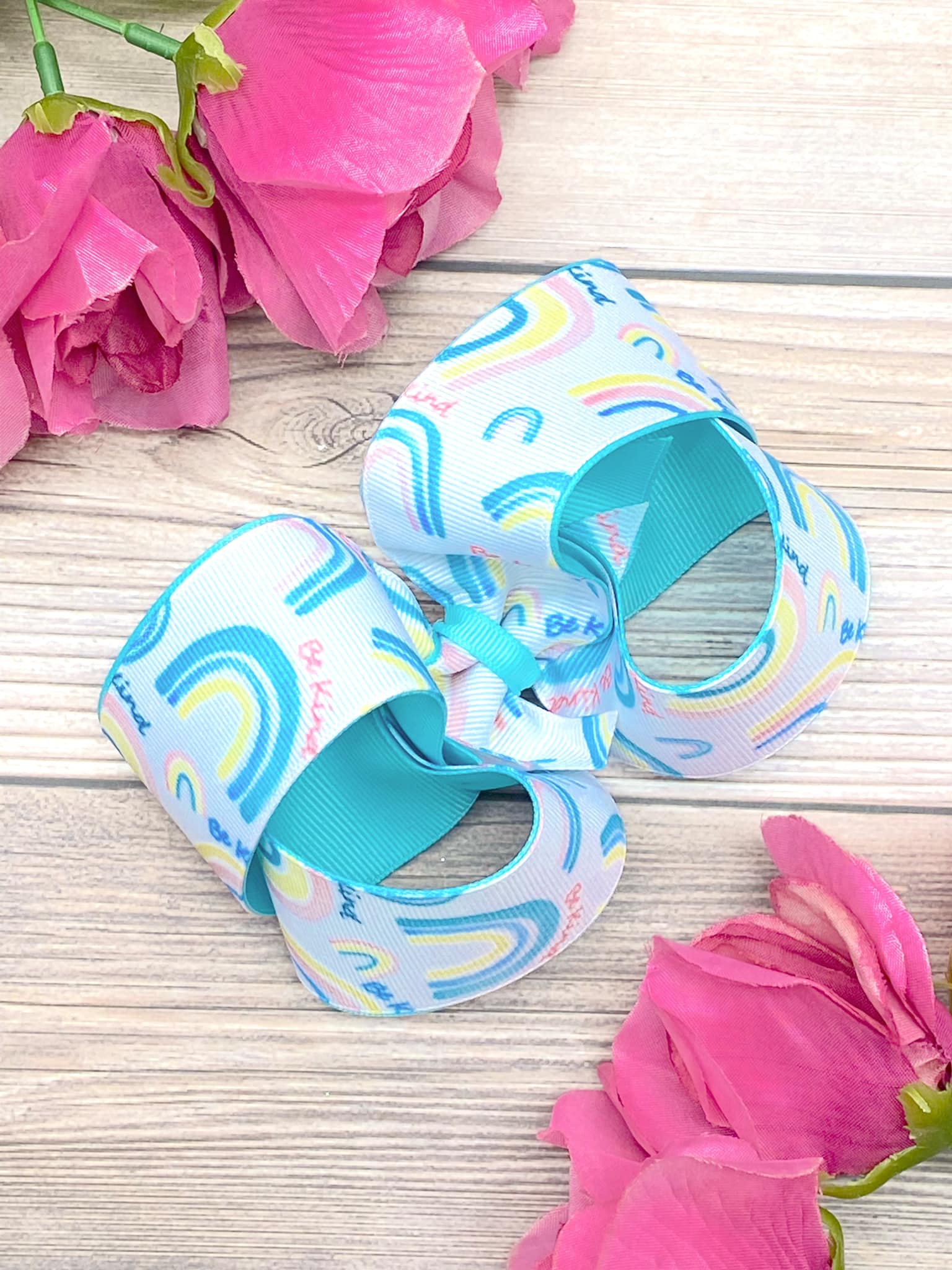 Twisted boutique bows made from white grosgrain ribbon with a pattern of rainbows in sky blue, aqua, pink and yellow and a message of "Be Kind" in the same sky blue and aqua. The 4" version is also lined in a light aqua grosgrain. This design is available in 2 sizes and all bows come on alligator clips with teeth.