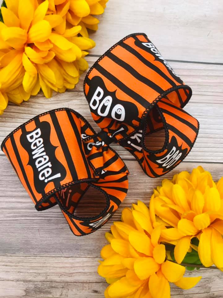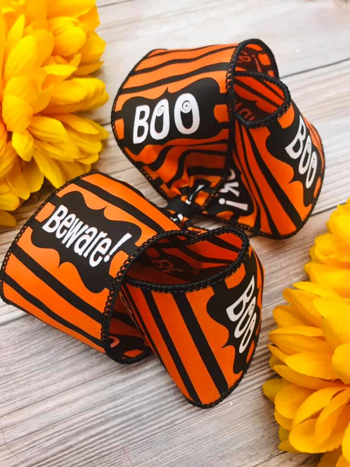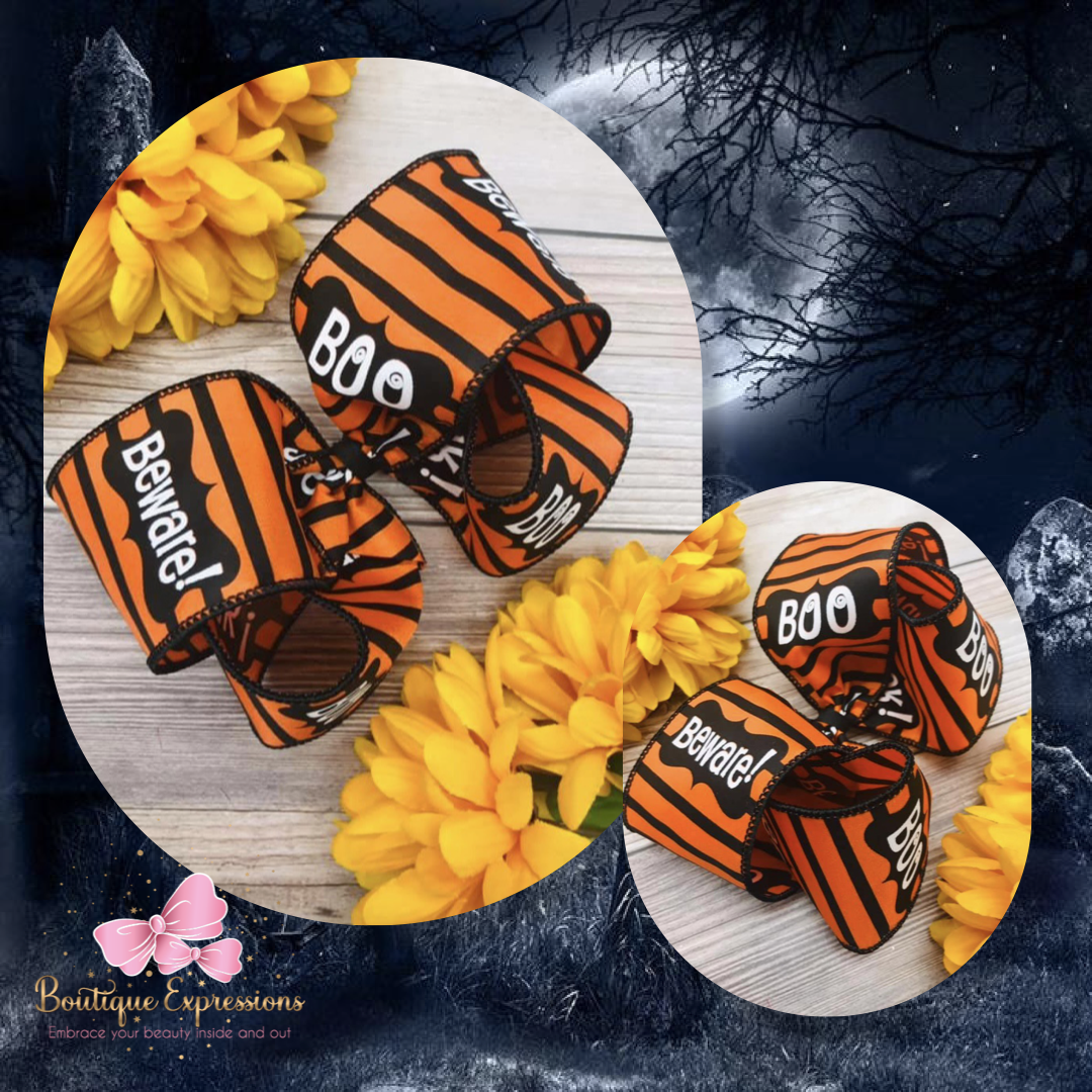 6" Twisted boutique hair bow with a black and orange Halloween design. All bows come on alligator clips with teeth.