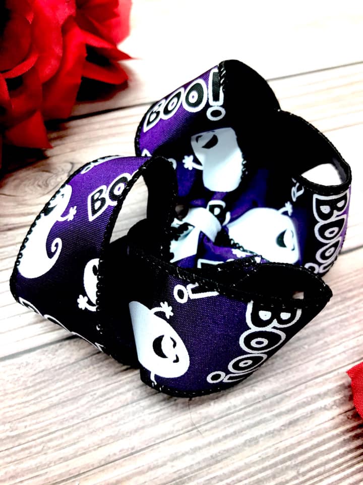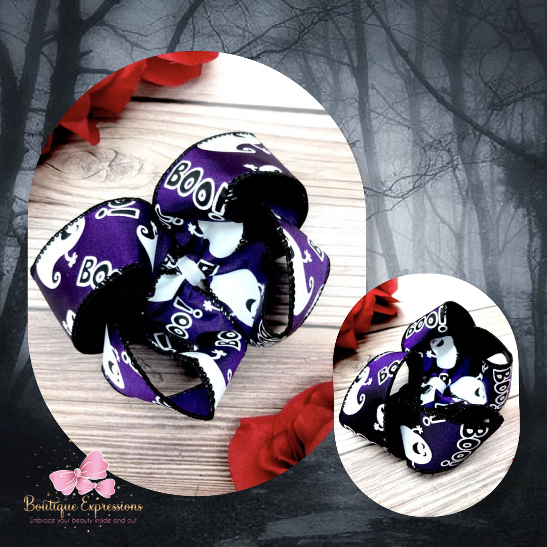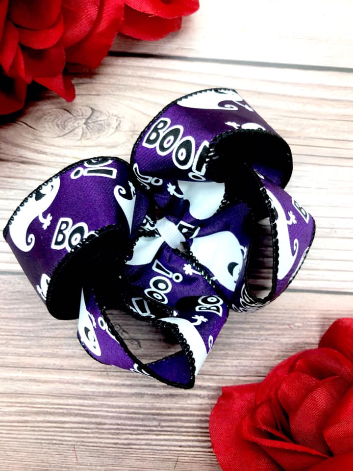 4" twisted boutique hair bow made with a satin plum ribbon with white ghost patterns. All bows come on alligator clips with teeth.
