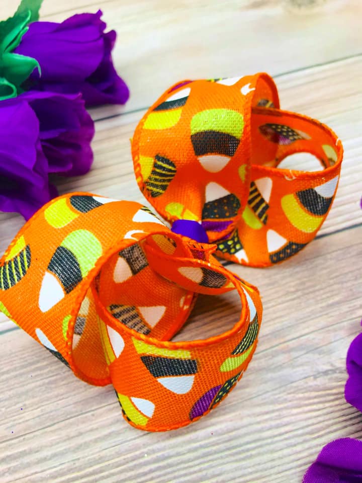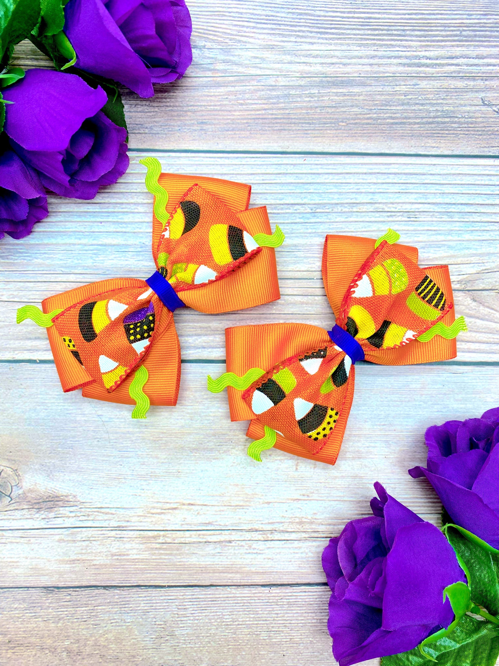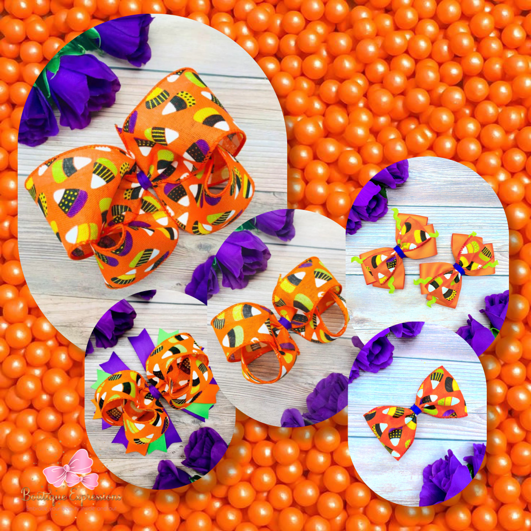 Boutique hair bows with a festive candy corn theme. Available in 5 sizes and all bows comes on alligator clips with teeth for a secure hold.