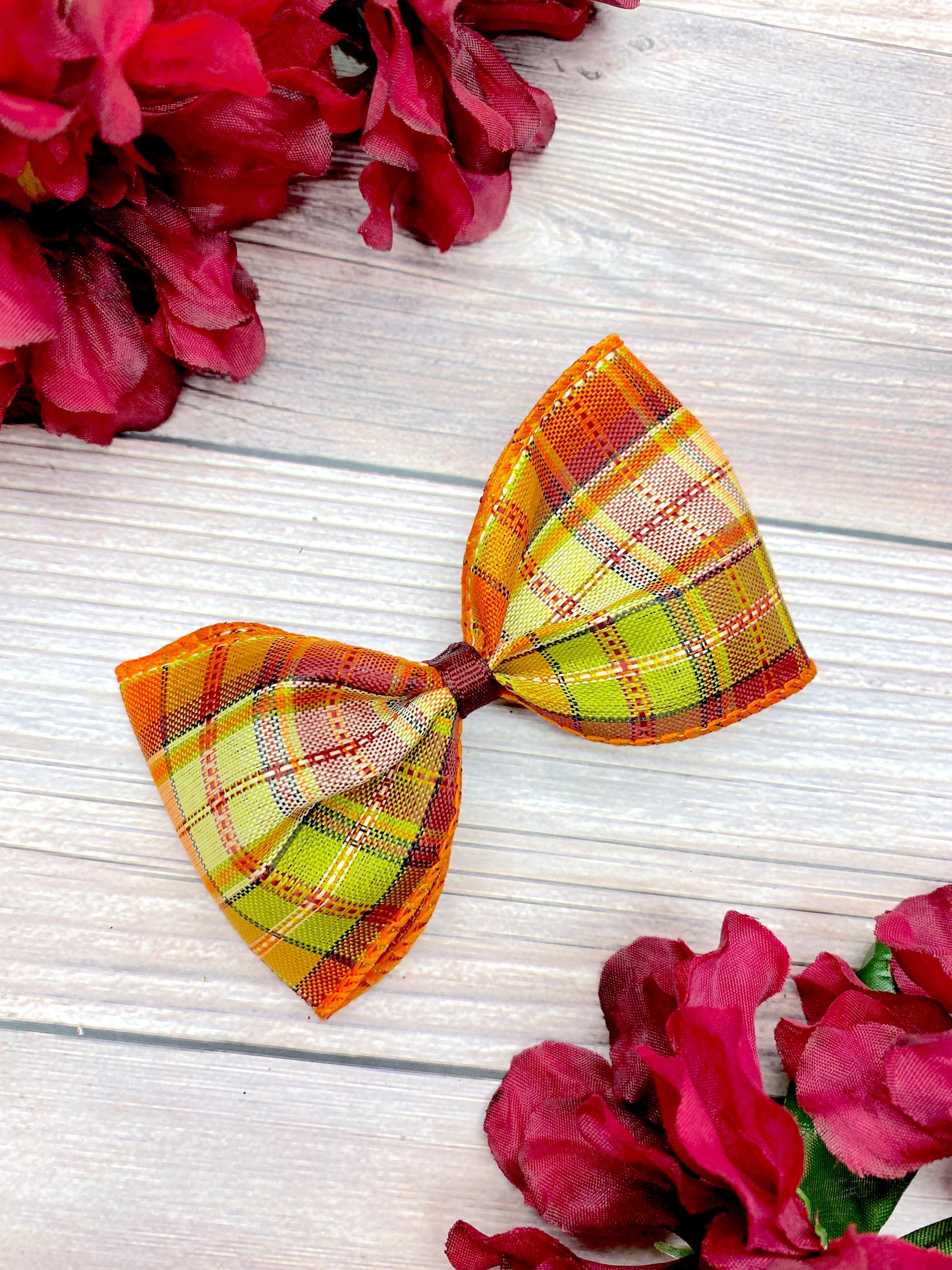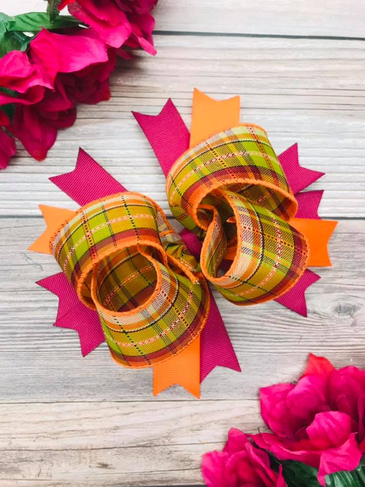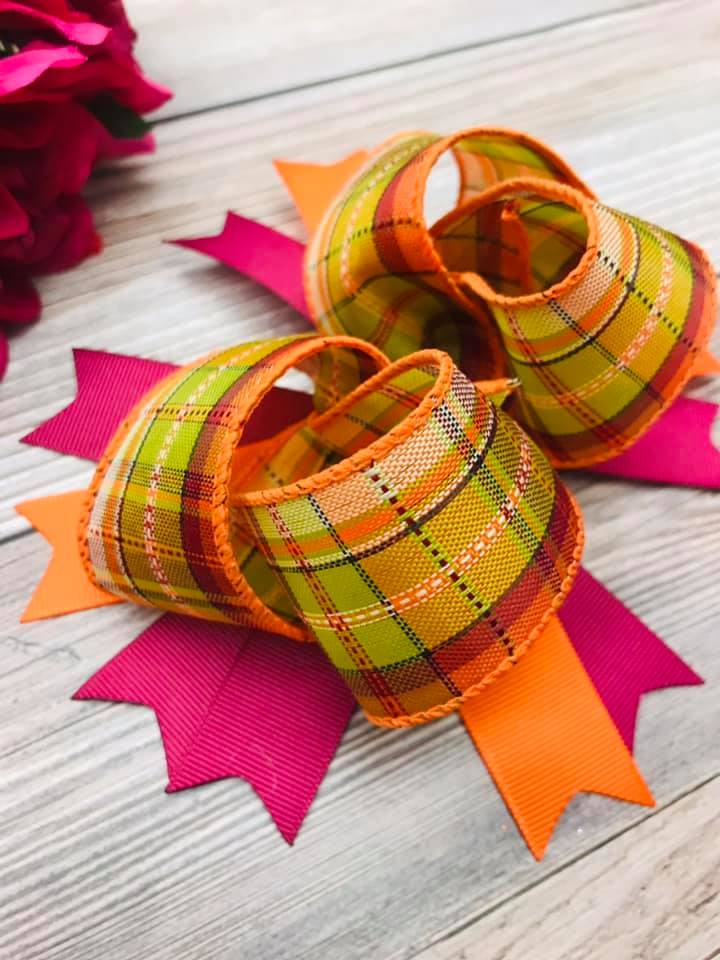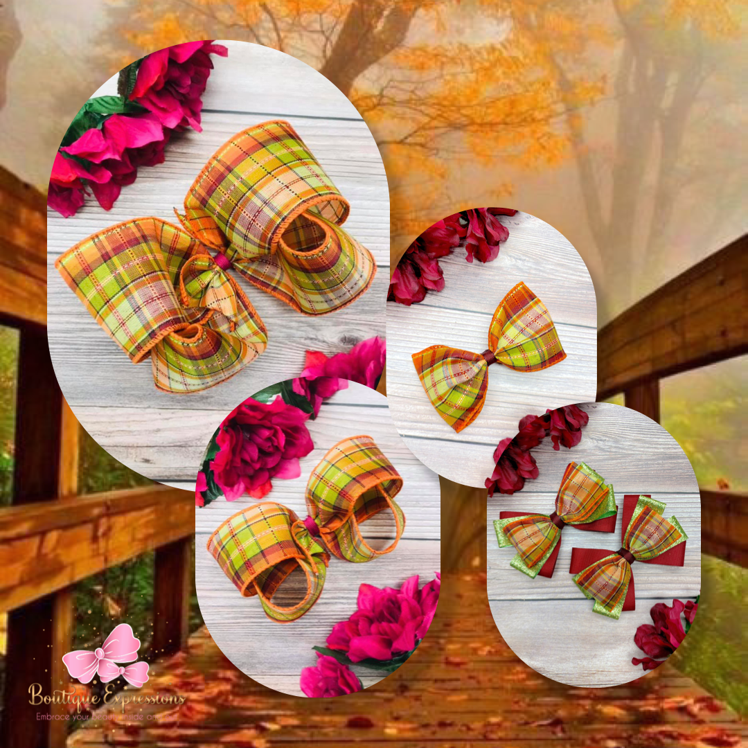 Boutique hair bows with an autumn plaid design with just a hint of cranberry stripe.