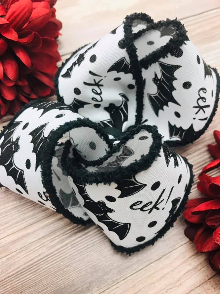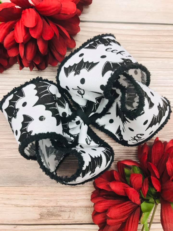 6" Twisted boutique bow made with canvas ribbon and a chenille edge. All bows come on alligator clips with teeth.