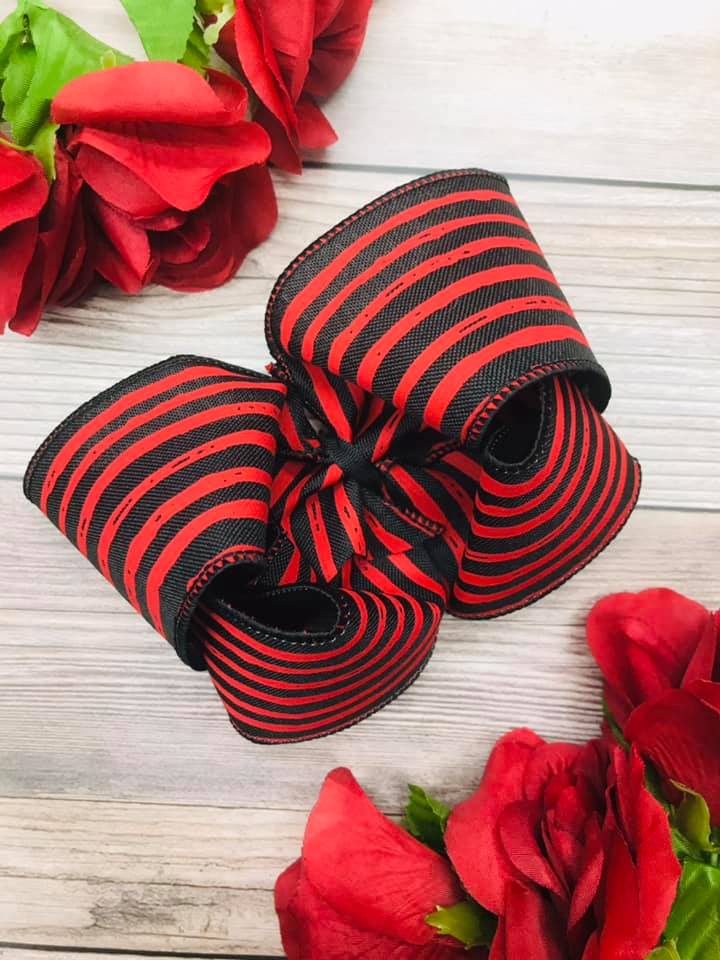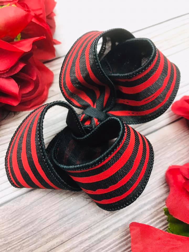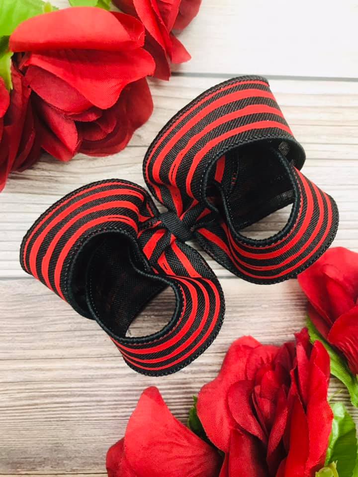 Twisted boutique bow with a black and red shredded stripes pattern. This design comes in 2 sizes and all bows come on alligator clips with teeth.