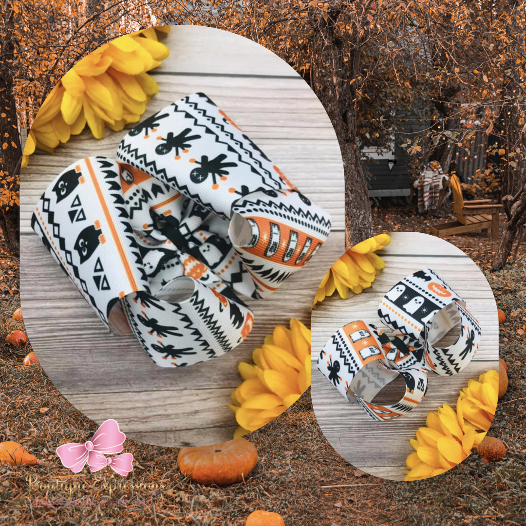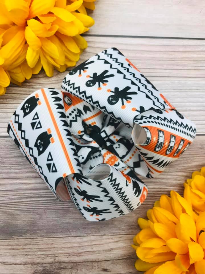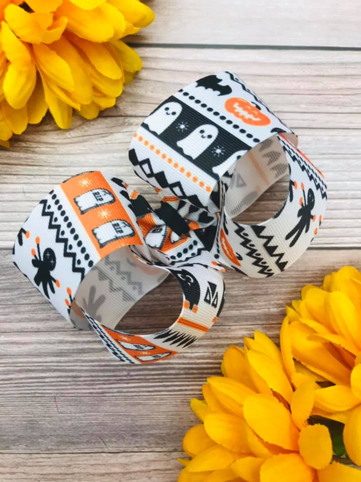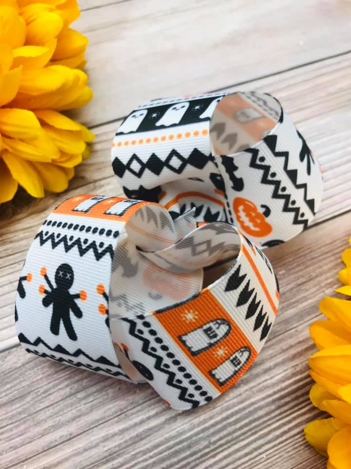 Twisted boutique bows in a classic Halloween pattern made with grosgrain ribbon. This design is available in 2 sizes and all bows come on alligator clips with teeth.