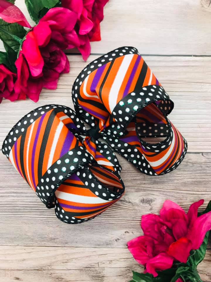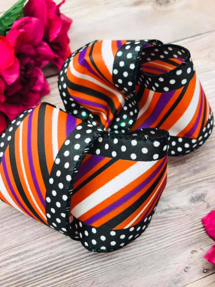 6" twisted boutique bow with a mix of polka dots and stripes in festive Halloween colors. It comes on an alligator clip with teeth for a secure hold.