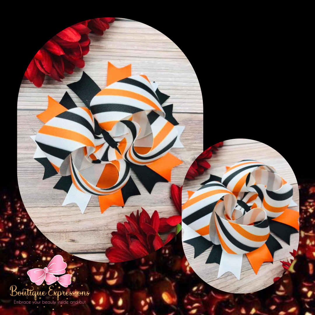 6.5" twisted boutique with spikes made from 1.5” striped orange, white, and black grosgrain ribbon. The spikes include a spray of 7/8” solid grosgrain ribbon in black, orange and white and all bows come on alligator clips with teeth.