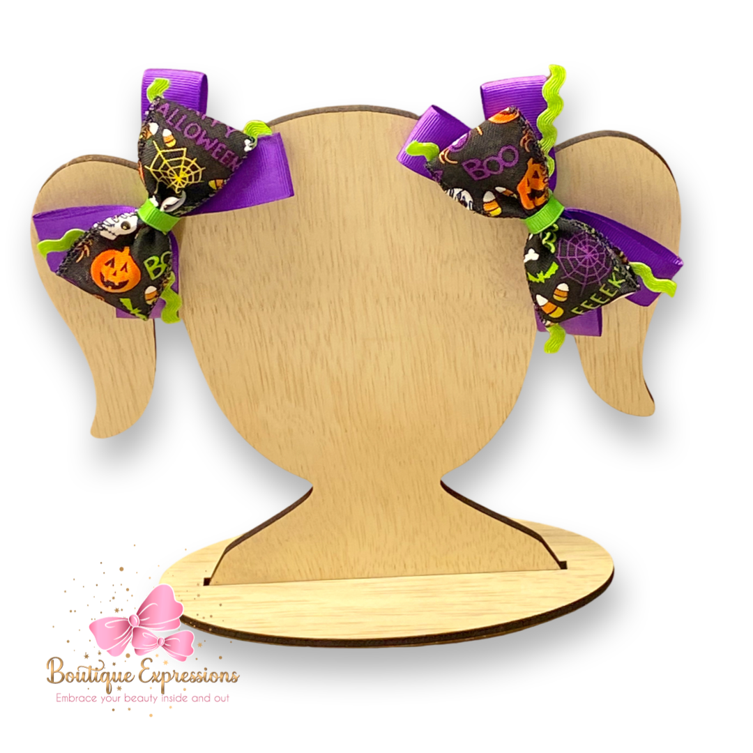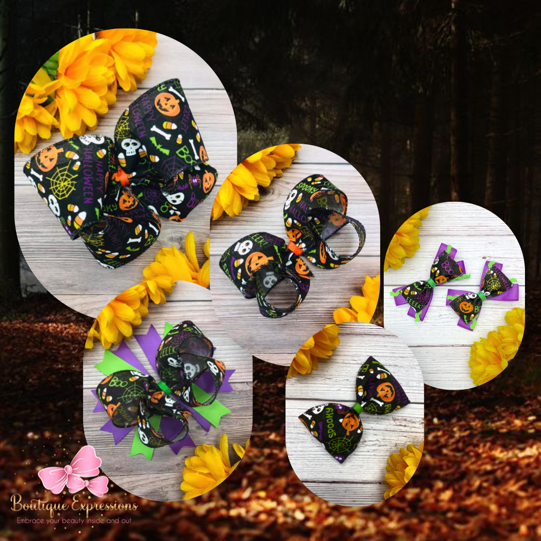 Twisted boutique bows with a Halloween candy theme. Available in 5 styles and all bows come on alligator clips with teeth for a secure hold.