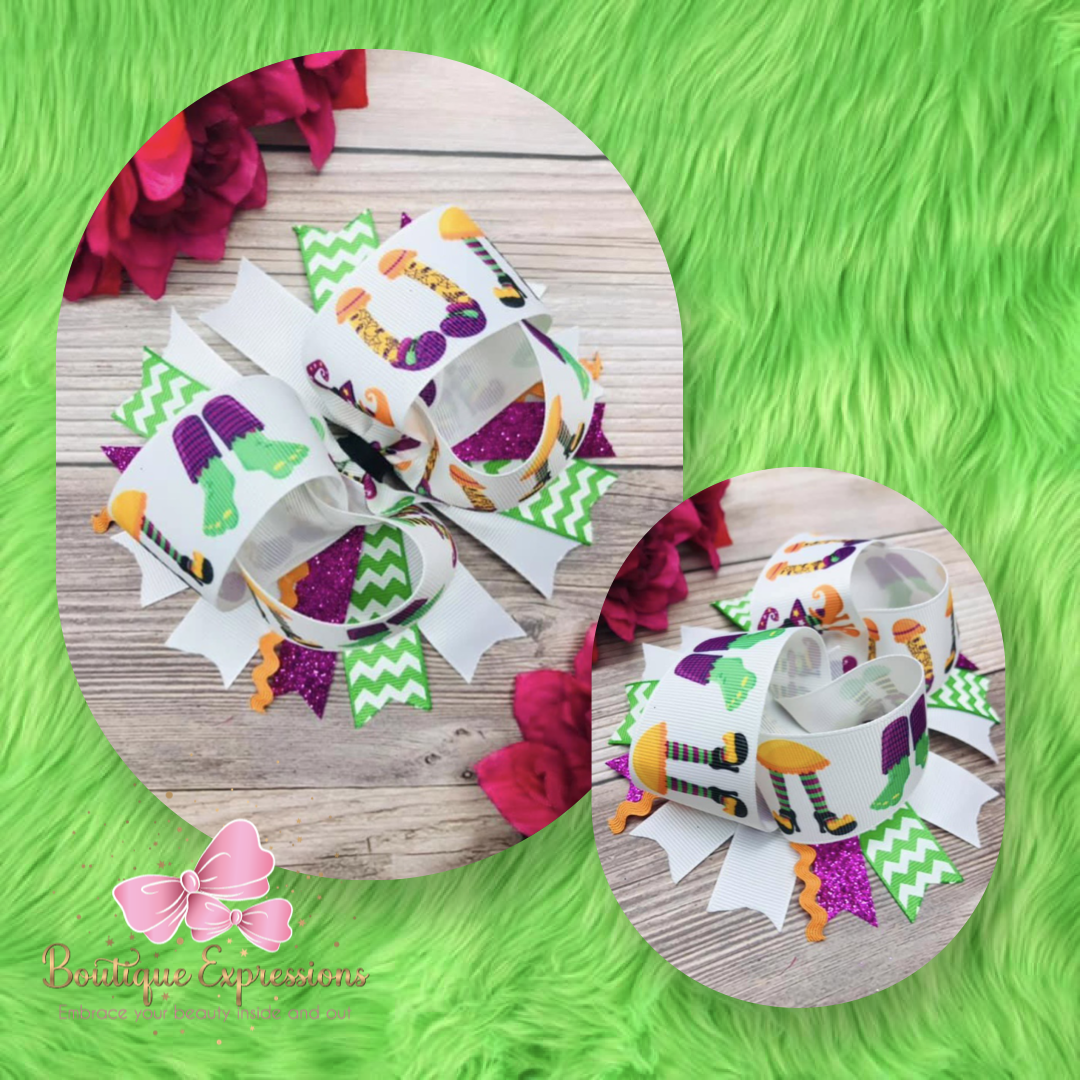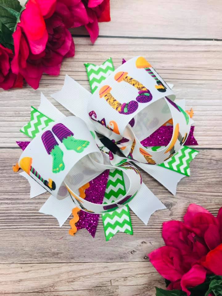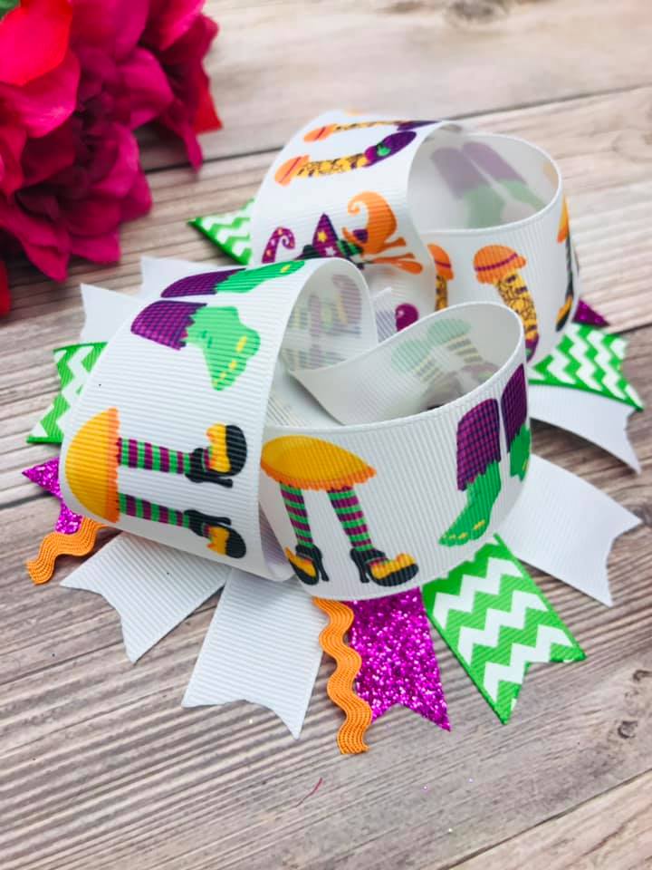 6.5" twisted boutique with spikes bow is perfect for a fun Halloween outfit with it's cartoon monster feet design. This bow is made from grosgrain ribbon and comes on an alligator clip with teeth for a secure hold.