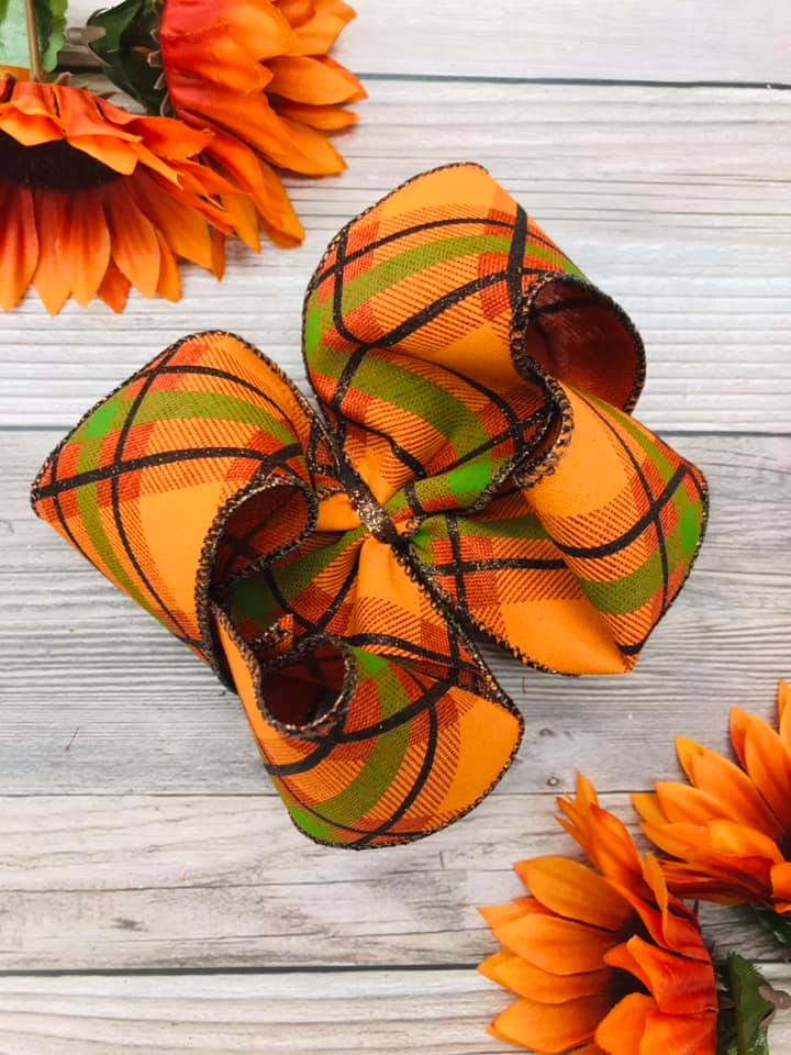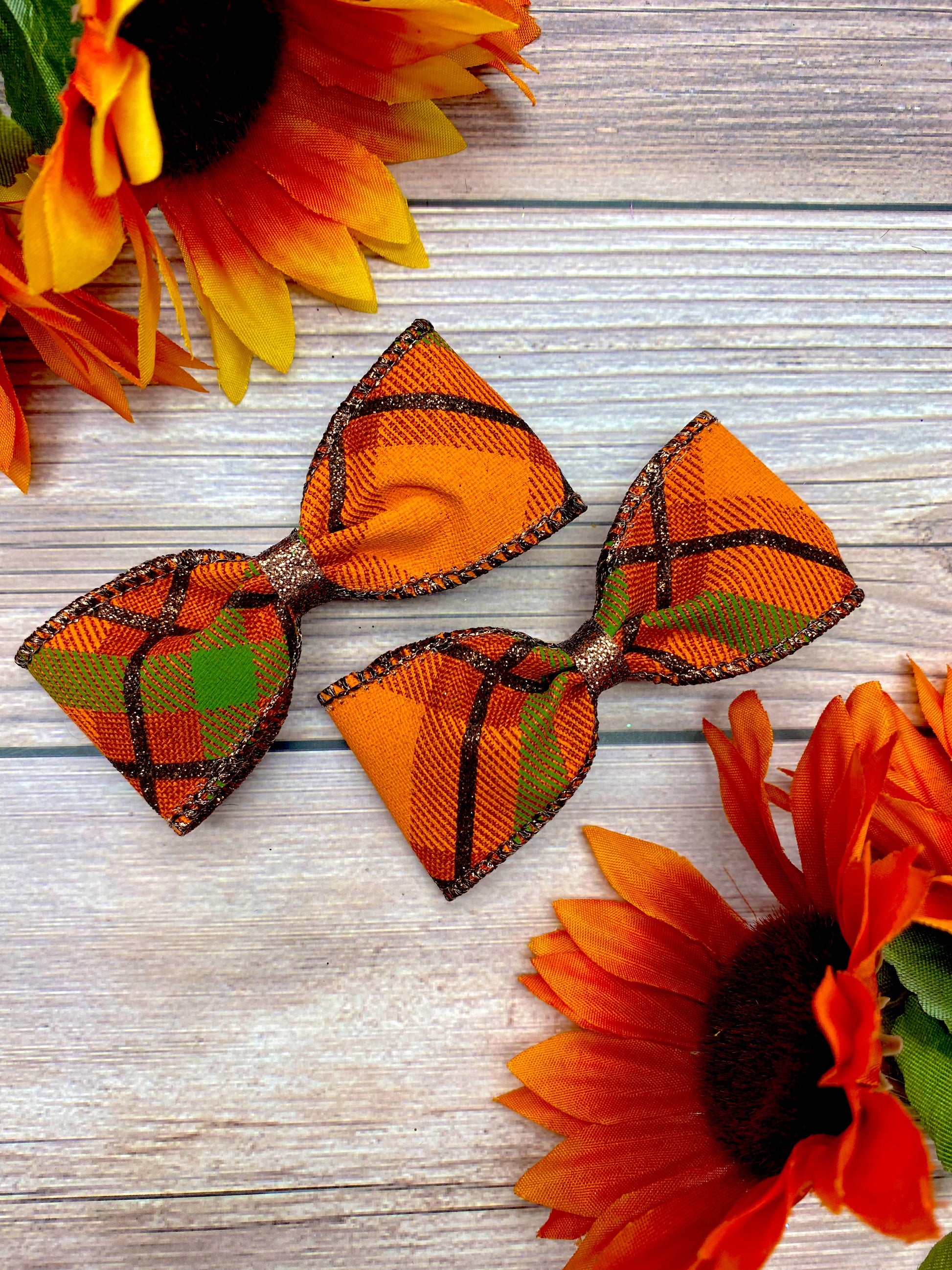 Boutique hair bows with a seasonal plaid pattern in dark orange and green and accents of brown glitter.