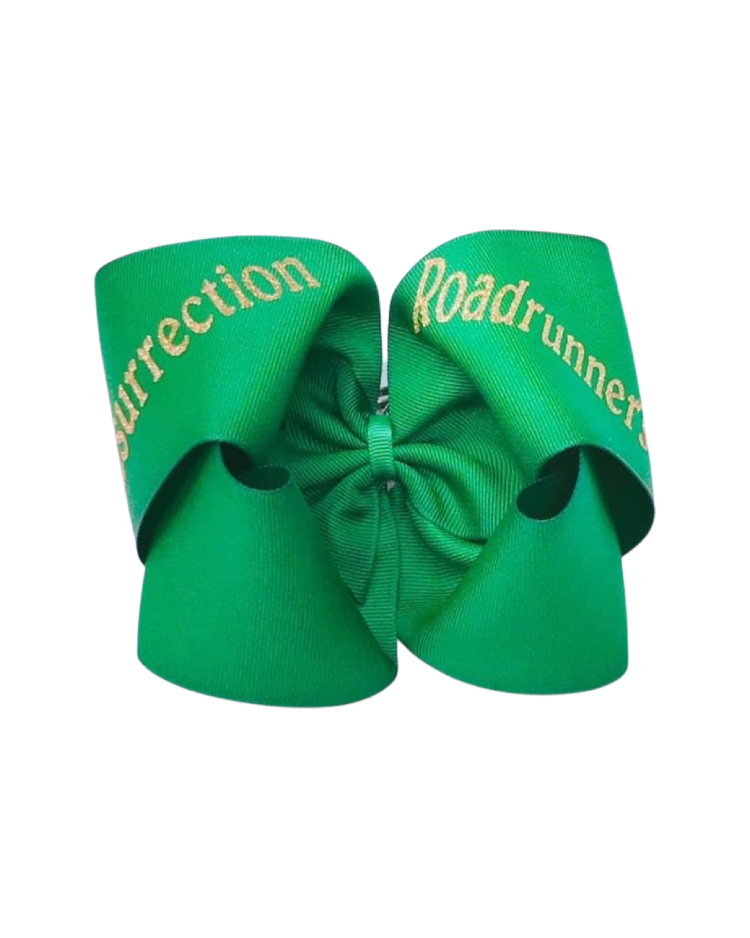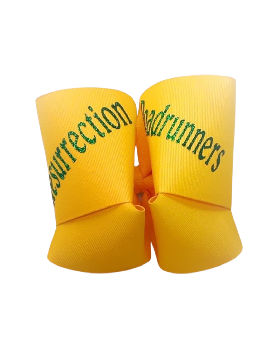 6" Twisted boutique bows are made from 3" wide grosgrain ribbon with school name and mascot written in glitter vinyl all in coordinating school colors. Bows come on 6mm lined alligator clips with teeth.