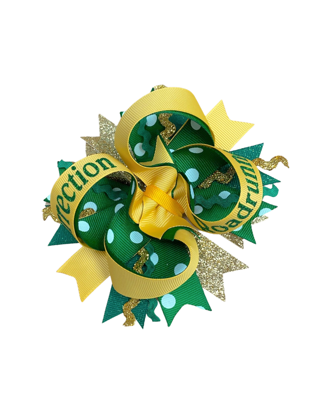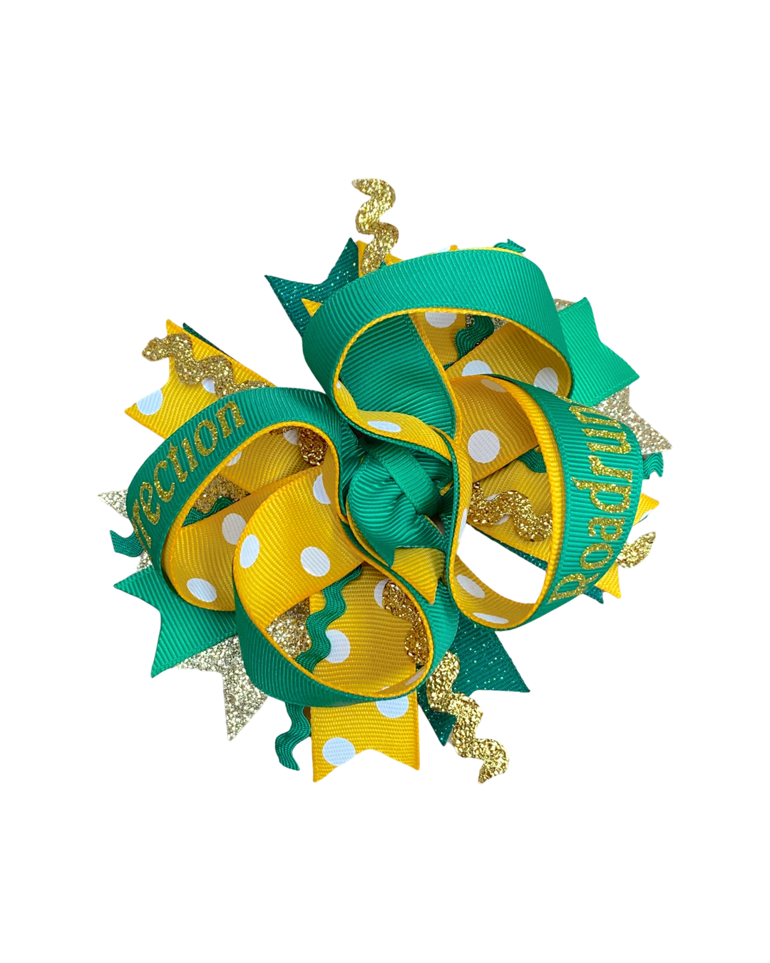 5.5" Twisted Boutique with spikes are made from grosgrain ribbon lined in pattern ribbon with school name and mascot written in glitter vinyl. Spikes are made from an array of grosgrain, glitter, and ric rac ribbons in coordinating colors. Bows come on a 6mm lined alligator clip with teeth.