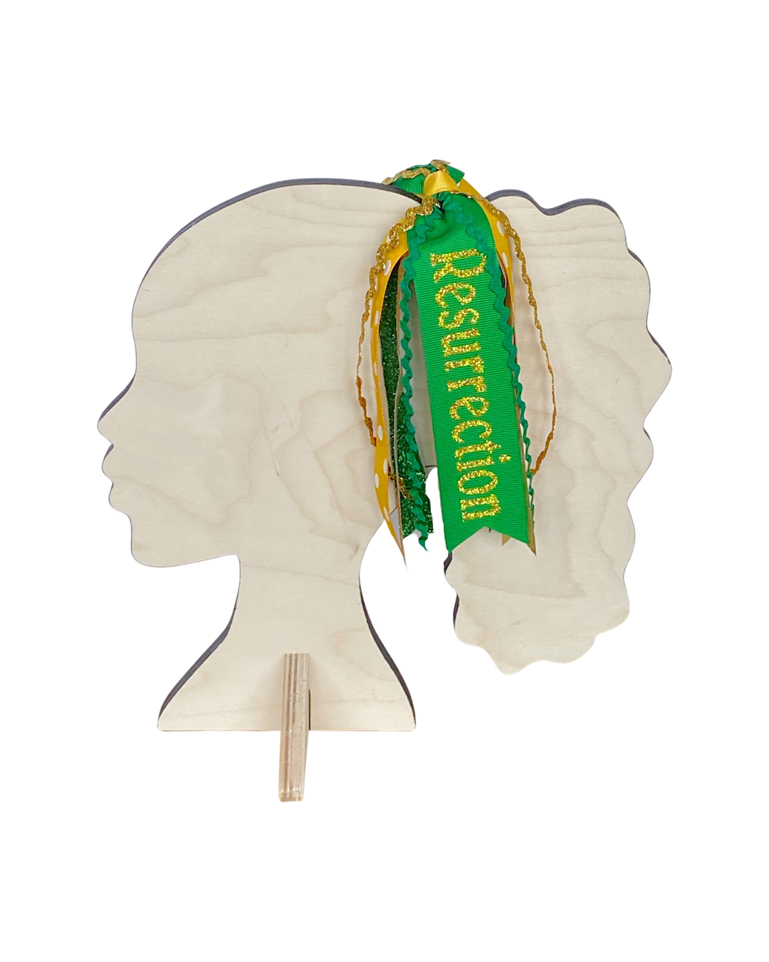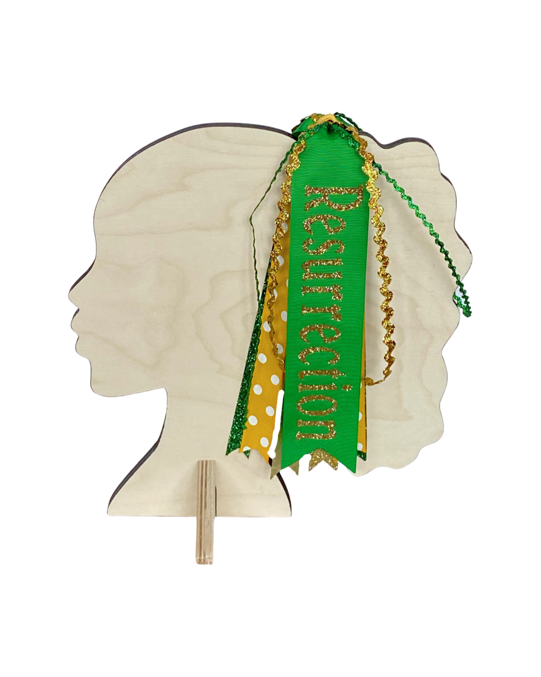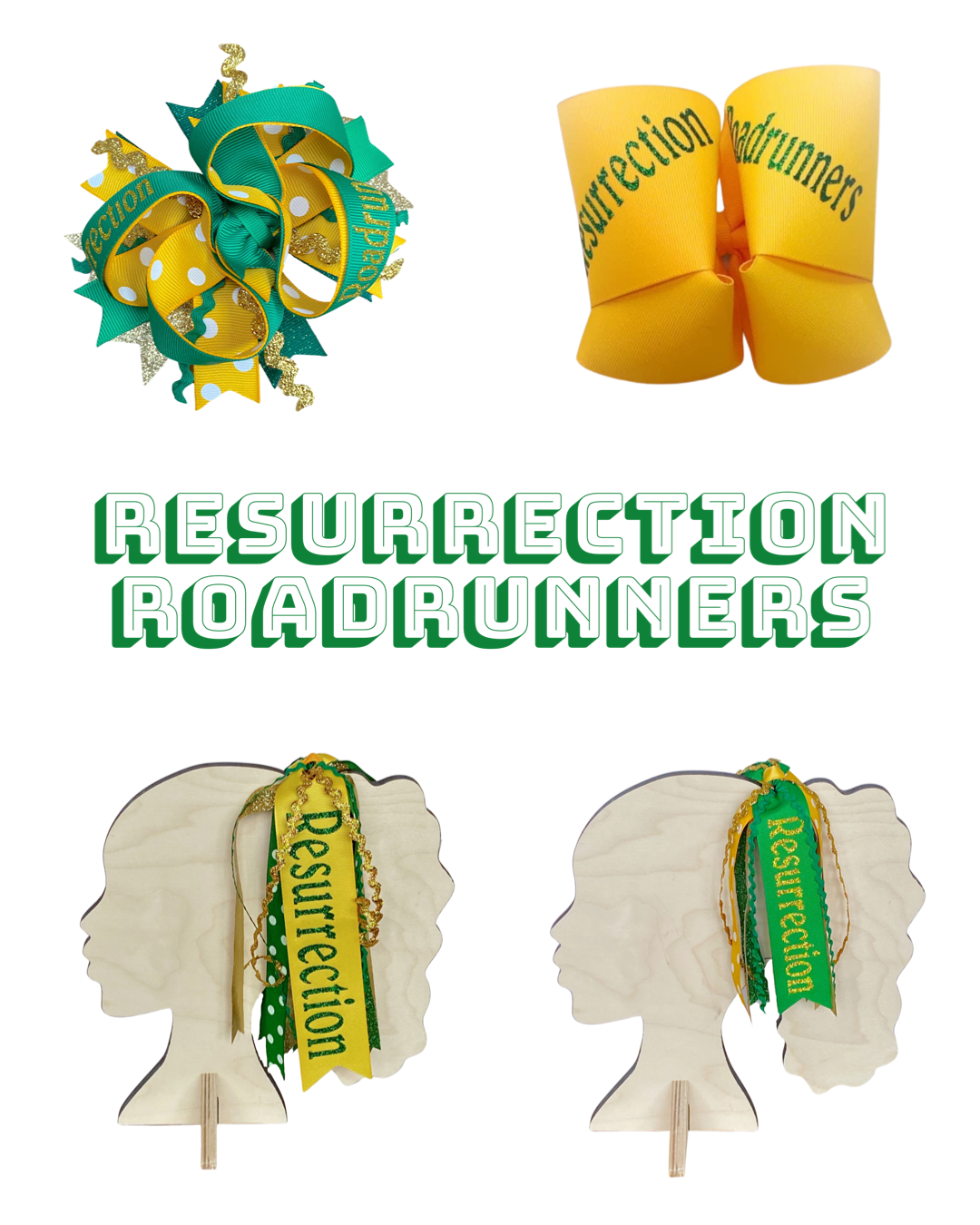 1 main ribbon with the school name in glitter vinyl, 4 glitter ribbons in coordinating colors, 4 ric rac ribbons in coordinating colors, and 2 pattern ribbons.