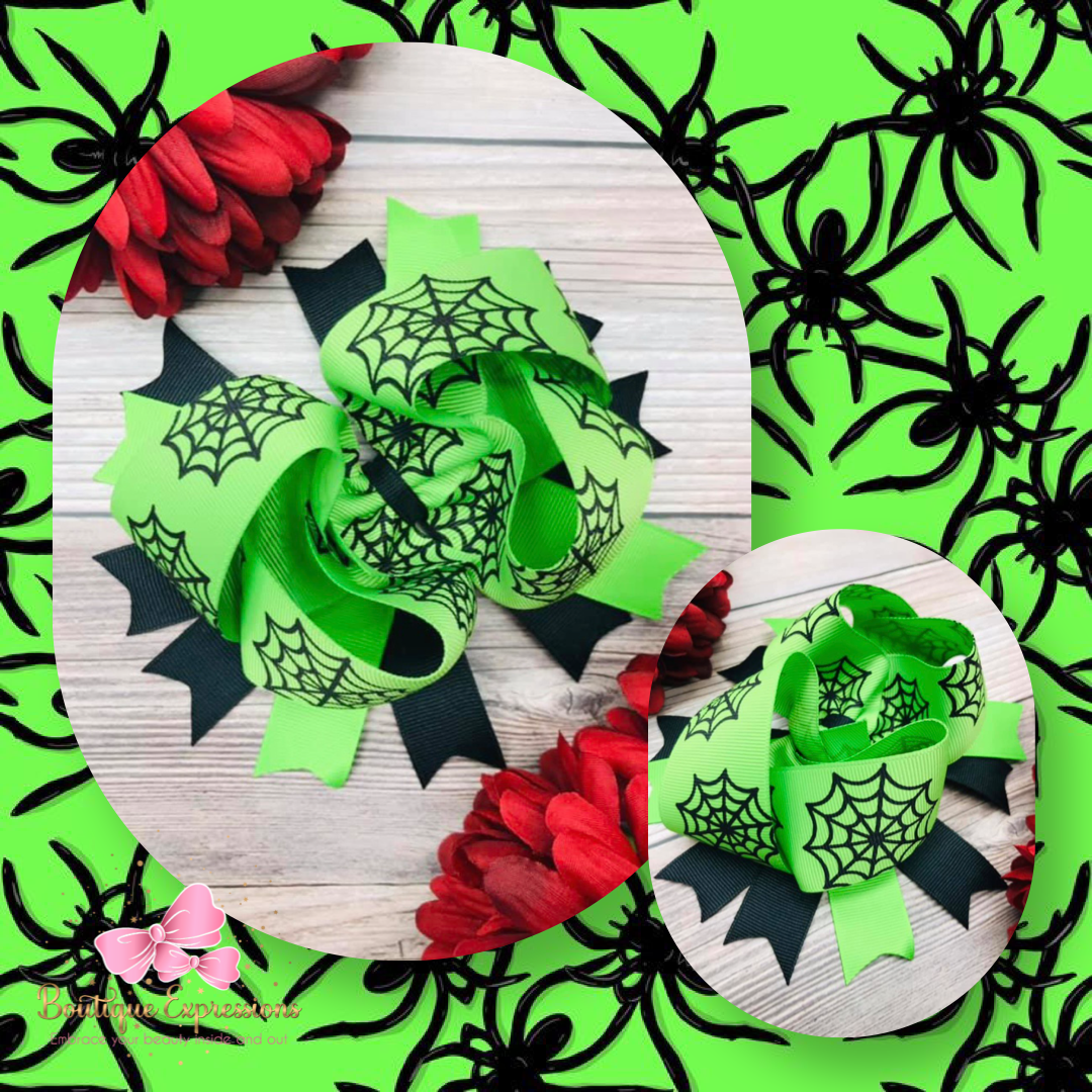 This 6.5" twisted boutique bow with spikes has a festive Halloween pattern and comes on an alligator clip with teeth for a secure hold.