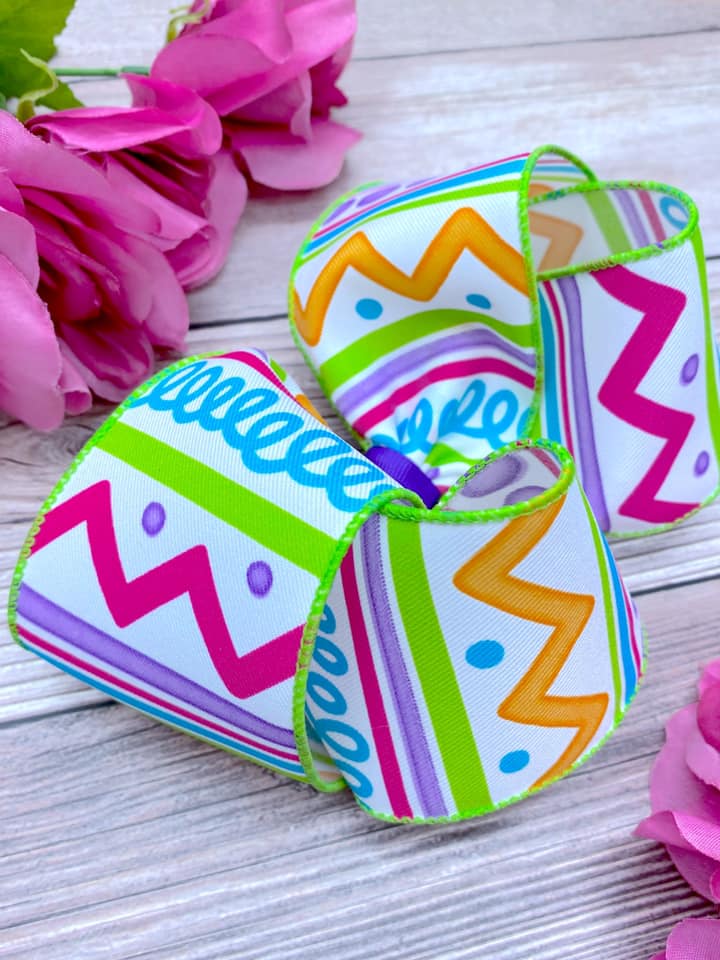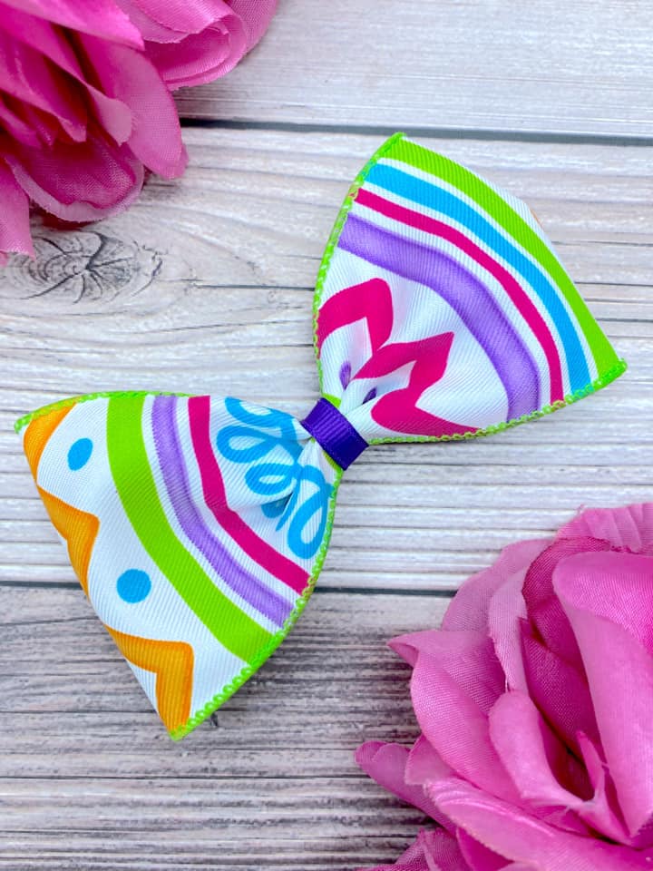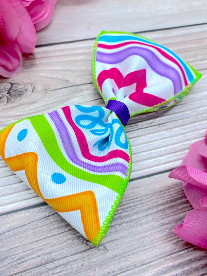 Boutique bows made from canvas ribbon with a pattern of stripes, polka dots and swirls in various colors. This design is available in 2 styles and all bows come on alligator clips with teeth.