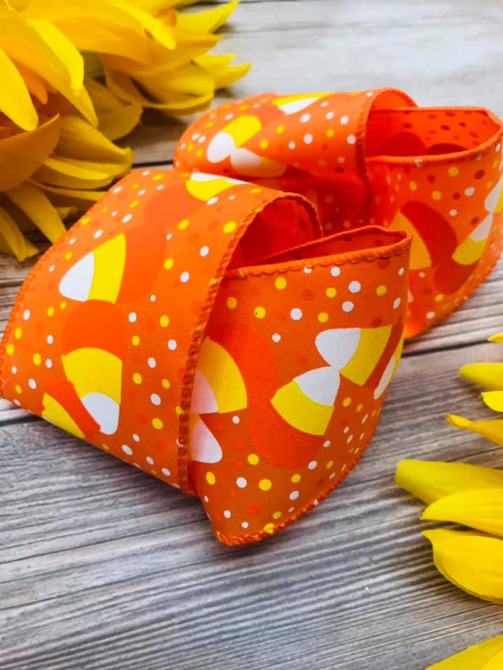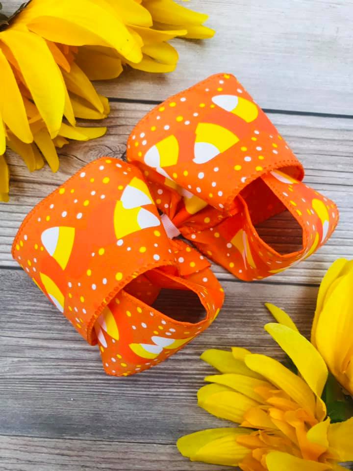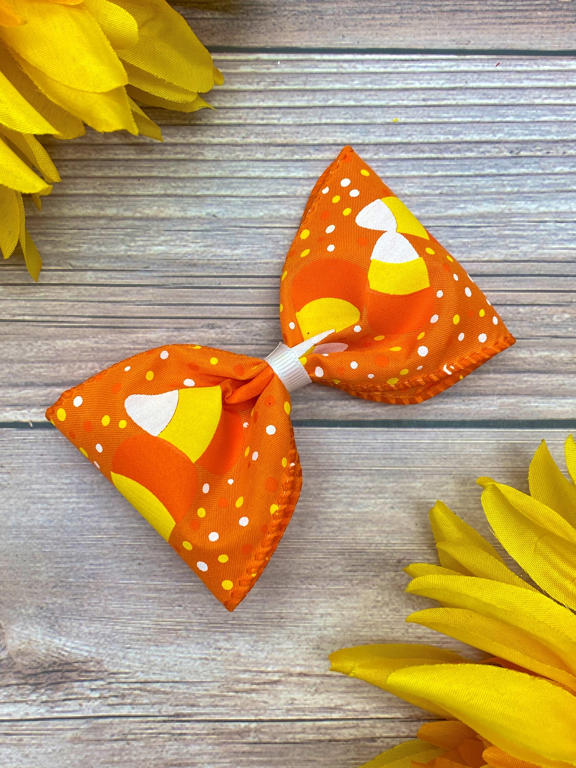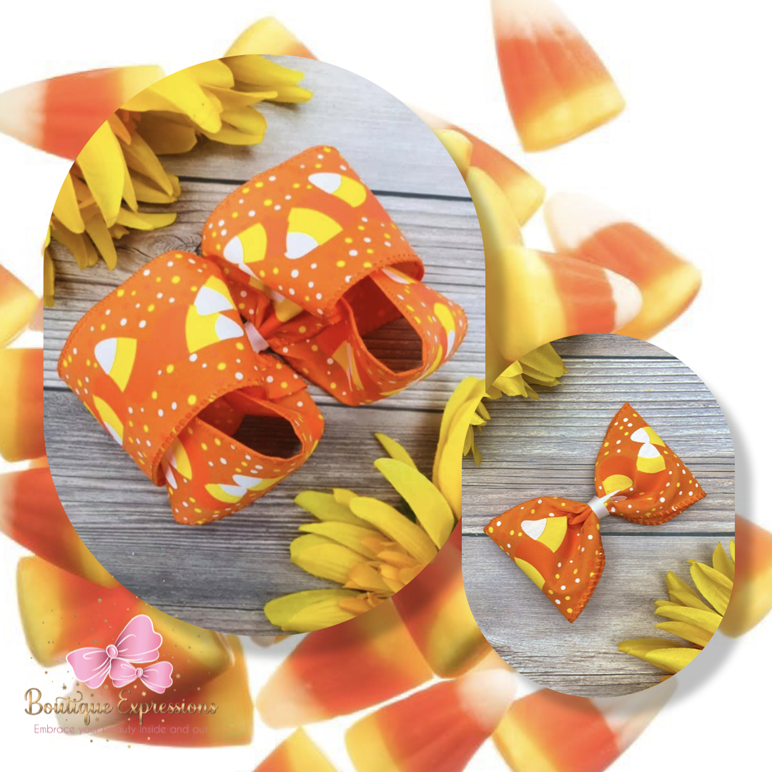 Boutique hair bows with a candy corn pattern on satin ribbon. All bows come on alligator clips with teeth.