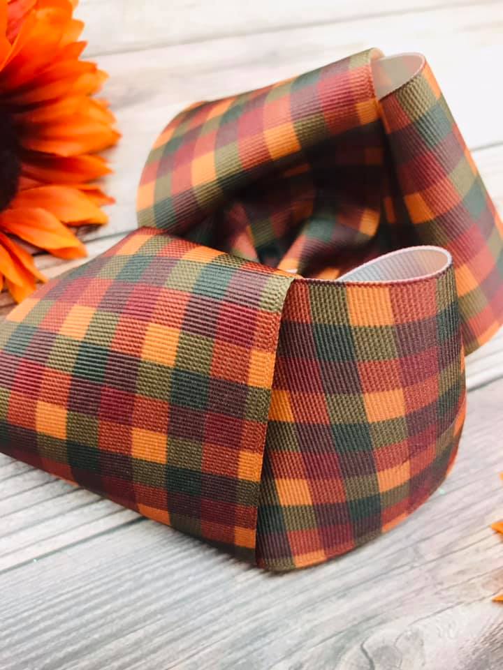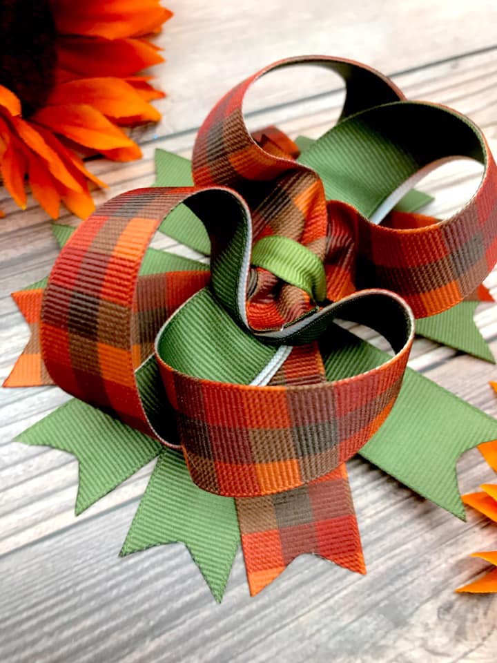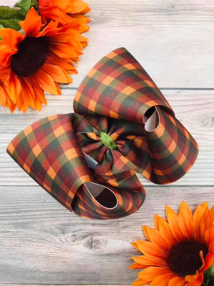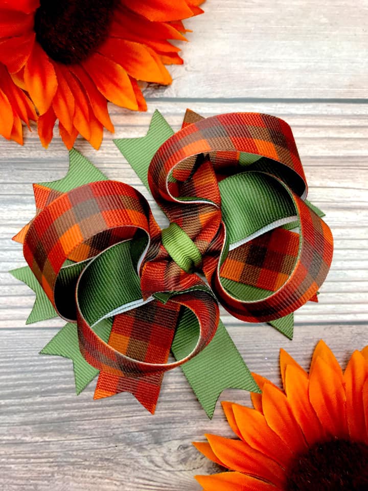 Twisted boutique hair bows made with an autumn plaid grosgrain ribbon and lined in army green.