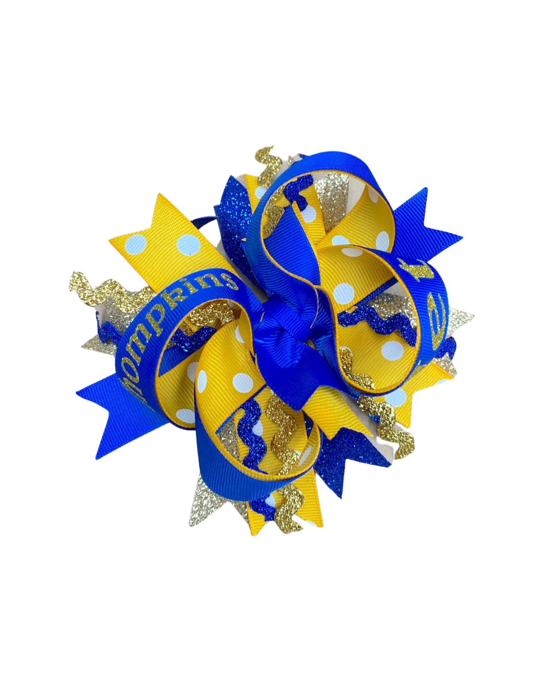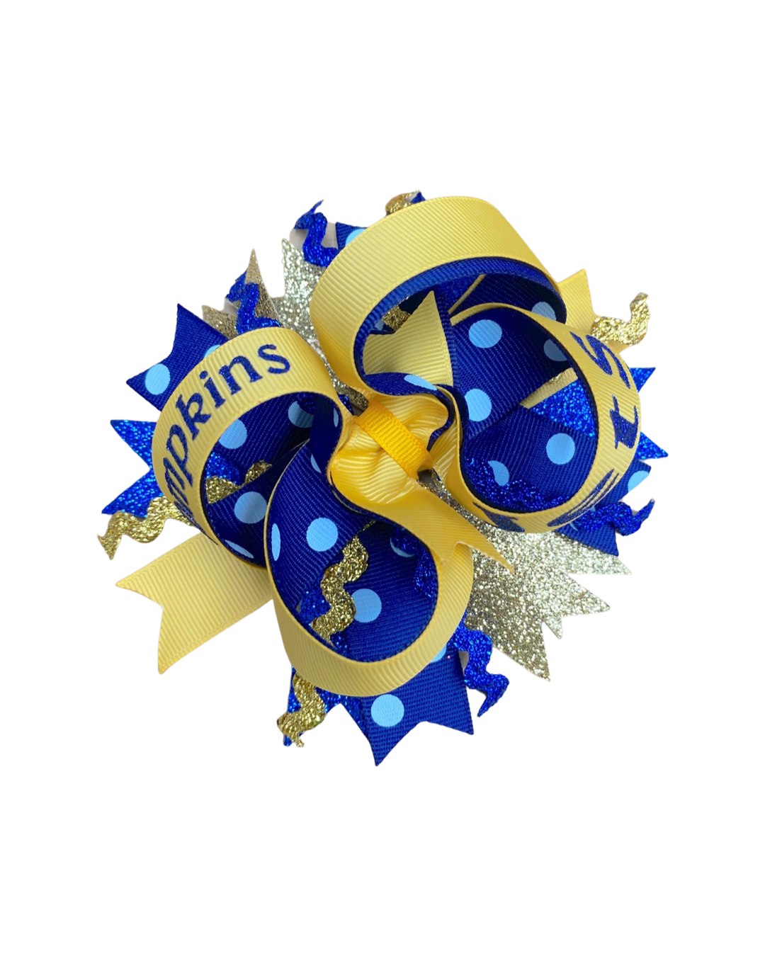 5.5" Twisted Boutique with spikes are made from grosgrain ribbon lined in pattern ribbon with school name and mascot written in glitter vinyl. Spikes are made from an array of grosgrain, glitter, and ric rac ribbons in coordinating colors. Bows come on a 6mm lined alligator clip with teeth.