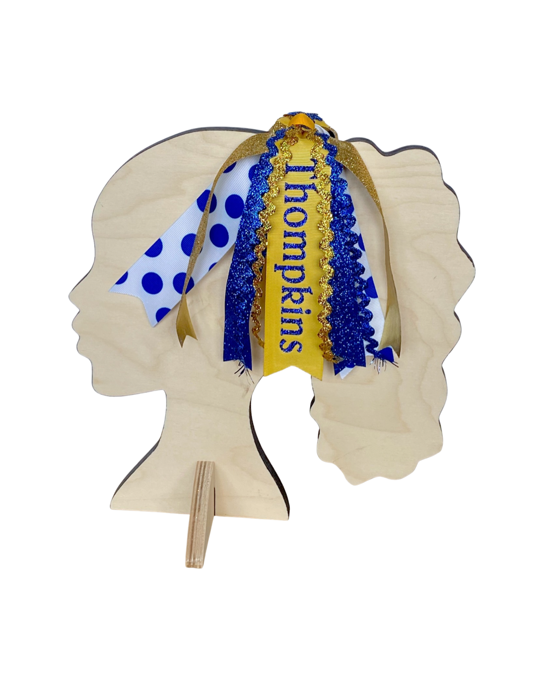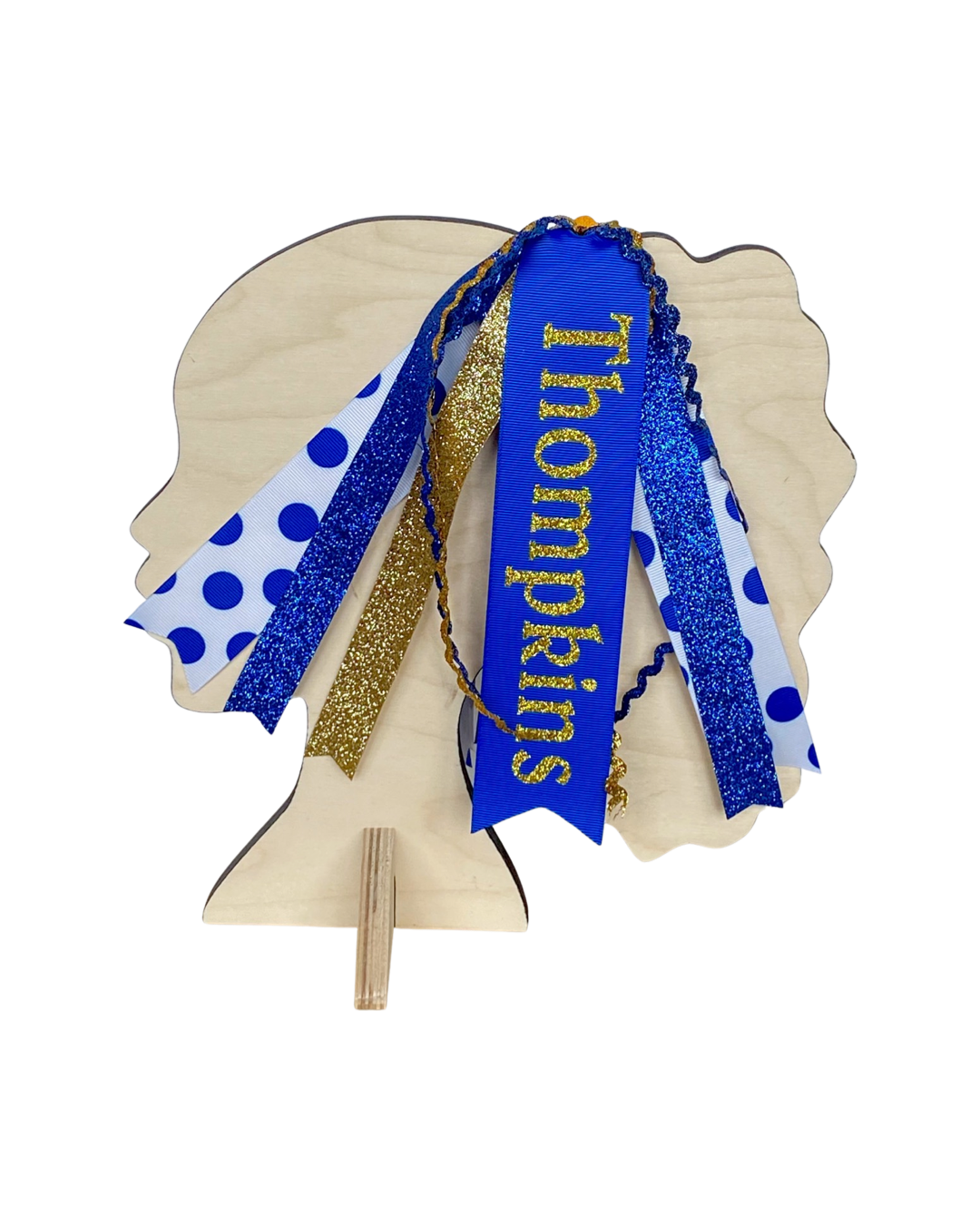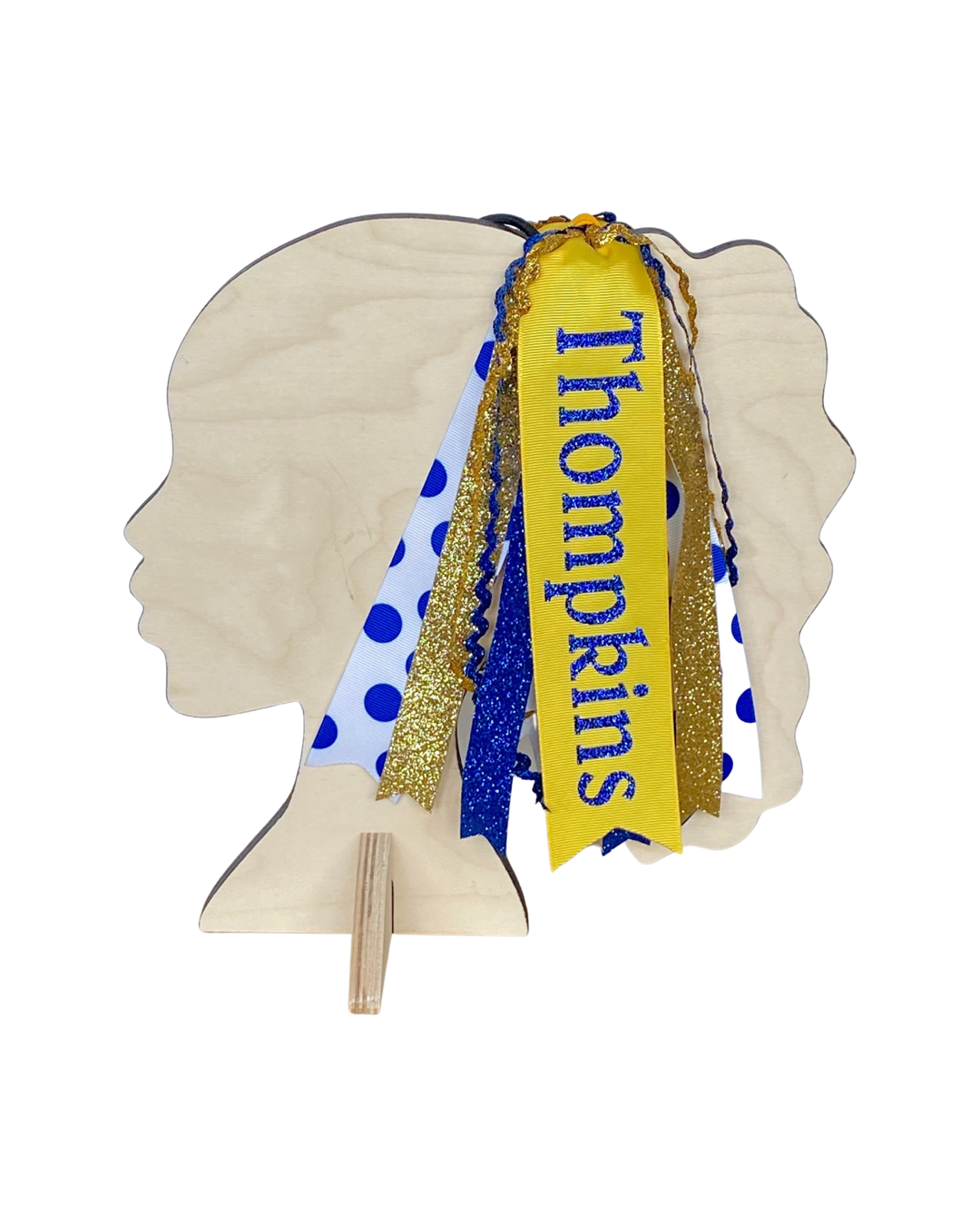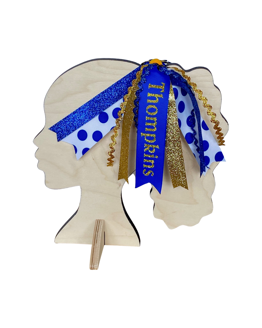 1 main ribbon with the school name in glitter vinyl, 4 glitter ribbons in coordinating colors, 4 ric rac ribbons in coordinating colors, and 2 pattern ribbons.